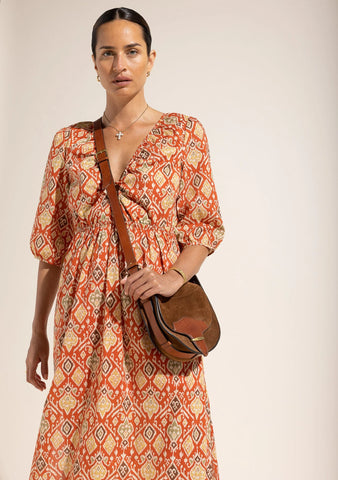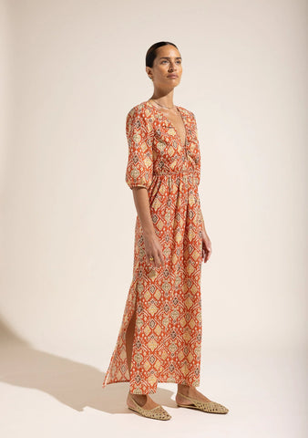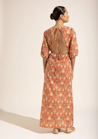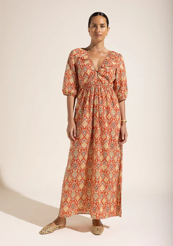 The Asmara Lee Maxi was designed for everyday dressing that is both easy-wearing and elegant. Crafted from soft cotton in our traditional Ikat print that is patterned by earthy hues, this dress has that elevated bohemian feel. Detailed with a fixed gathered neckline that pulls into a modest cut-out, a feminine sleeve and an open back with a functional drawcord.