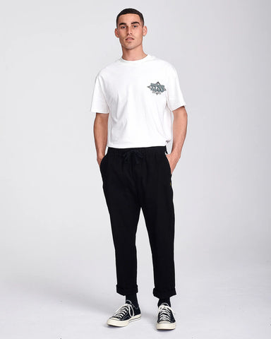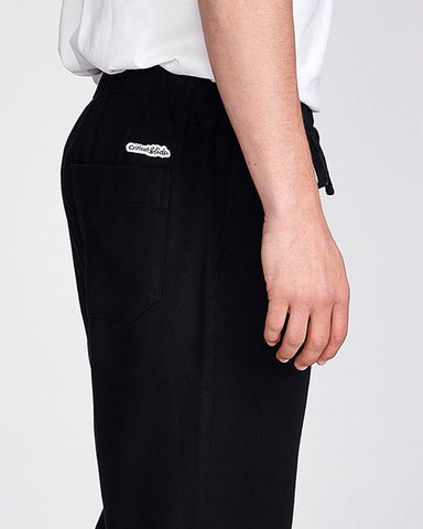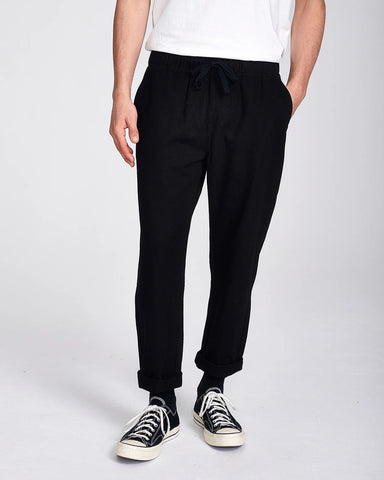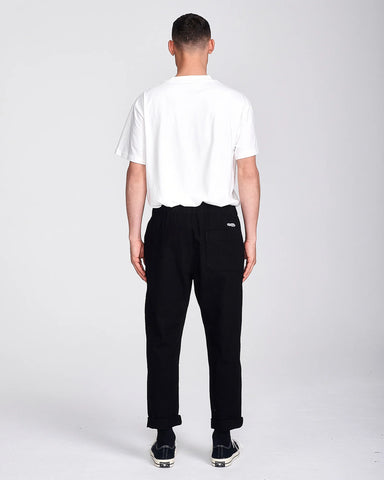 A mid-weight cotton twill pant. Elastic waist with internal drawcord. Oversize back patch pocket and slightly tapered leg