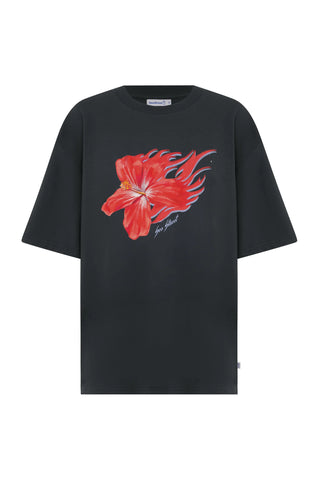 Turn up the heat with the Flaming Hibiscus Short Sleeve — a bold floral statement with serious attitude. This washed-black tee features a striking oversized hibiscus ignited in flame, bringing a punch of tropical energy.