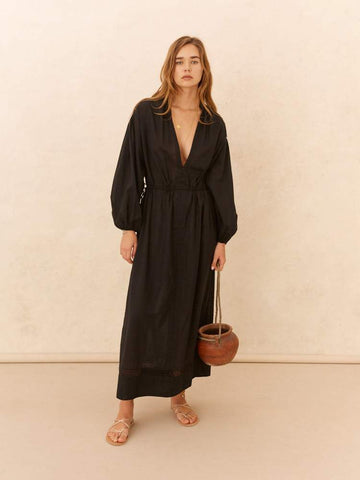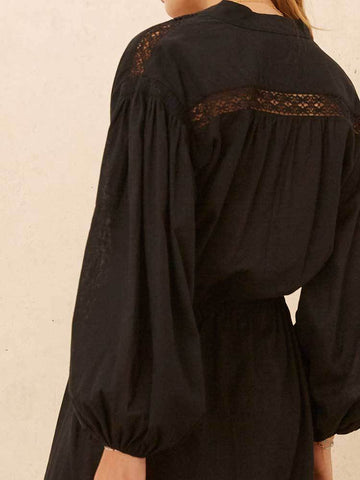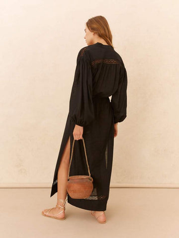 Maxi length sits just above the ankle, side splits and drawstring waist can be worn relaxed or pulled in and bloused. Intricate lace insert panels, internal buttons at CF and soft elastic at cuffs.
