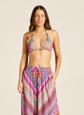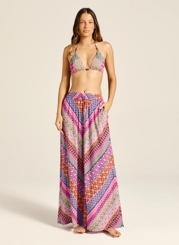 Step into effortless style with the Sabina Pant, a wide-leg palazzo design adorned with a striking chevron print. Featuring a ruffle-edged elastic waistband and a drawstring finish, these versatile pants offer both comfort and flair. Complete with convenient side slash pockets, the Sabina Pant can be worn as a statement piece or layered over swim for relaxed, sun-soaked days.