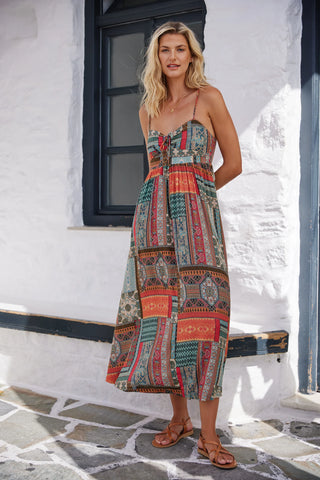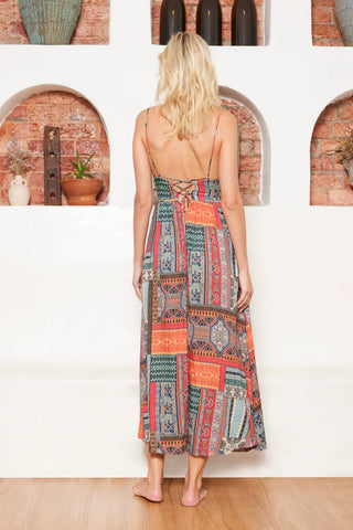 - Fitted bodice with adjustable tie at back finished with brass beads