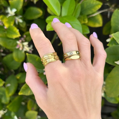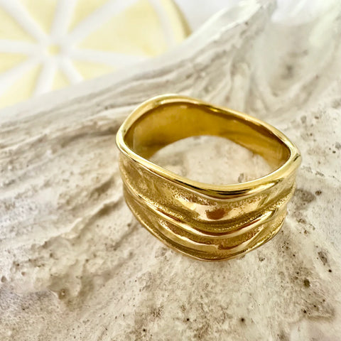 With its bold wavy design in premium stainless steel and a radiant gold finish, this ring is both a statement piece and an everyday essential.
