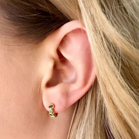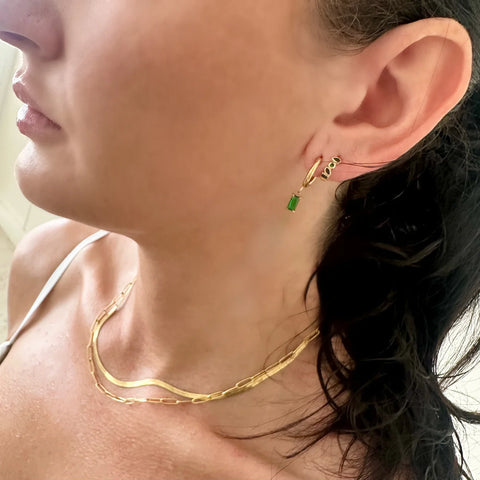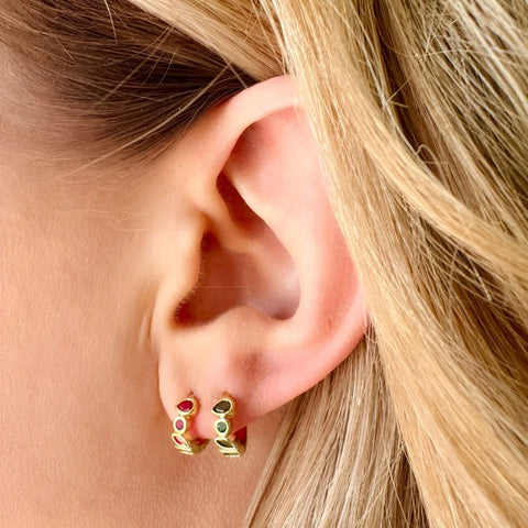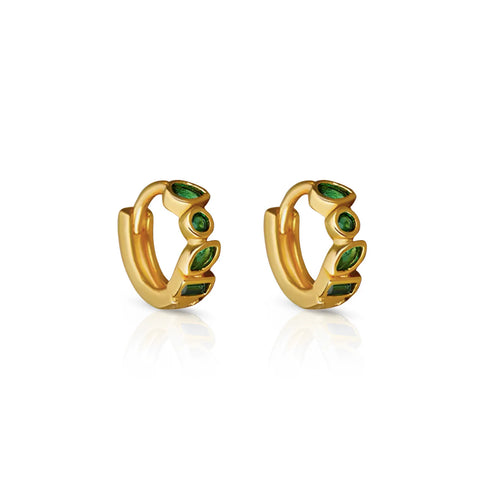 Featuring a stunning array of Emerald stones set in sleek gold plating, these hoops are the perfect pop of colour for your everyday look.