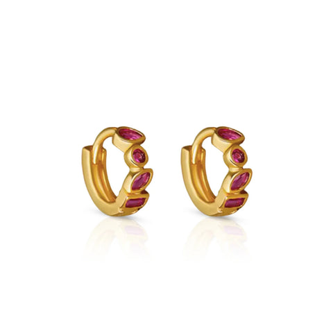 Featuring a stunning array of Ruby stones set in sleek gold plating, these hoops are the perfect pop of colour for your everyday look.