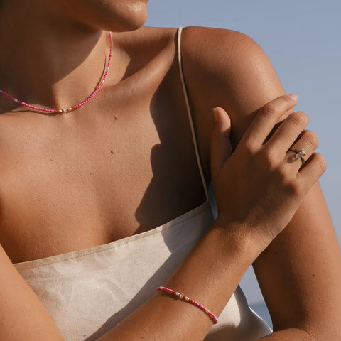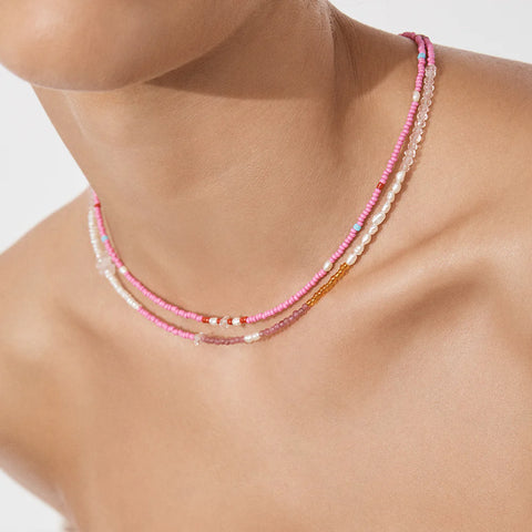 "The Balmy necklace embodies the warm breeze, that flows through the air on a tranquil summer’s night. The blushed colours of the sunset harmonise with dainty Freshwater Pearls. A small Herkimer Diamond features in the centre of the necklace, encouraging the wearer to align + balance their thoughts, allowing them to flow freely."
