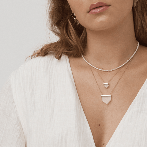 The iridescence of the enchanting aurora phenomena is captured in the Mini Aurora Crystal Necklace. Featuring a fine link chain, a beautiful mini, new cut clear quartz crystal and our signature clasp with a hanging clear quartz drop crystal. Clear quartz creates clarity and provides incredible spiritual guidance, allowing the wearer to connect to their higher self.
