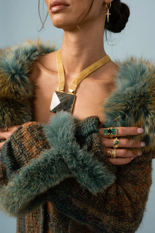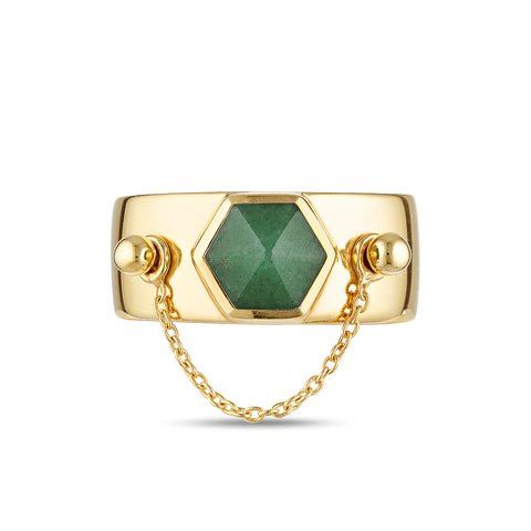This statement piece features a stunning Green Aventurine pyramid cut gemstone that is sure to turn heads. Known for its calming and soothing properties, this gemstone will bring a sense of serenity and positivity to your life.