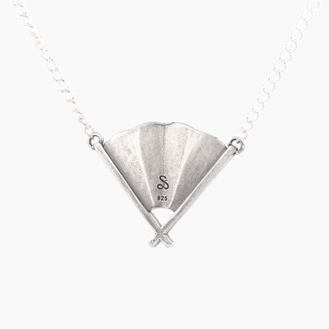 The Hand Fan Pendant features a 3cm x 2.2cm hand fan pendant with an engraved cherry blossom on a long cub chain, cast in 925 sterling silver.