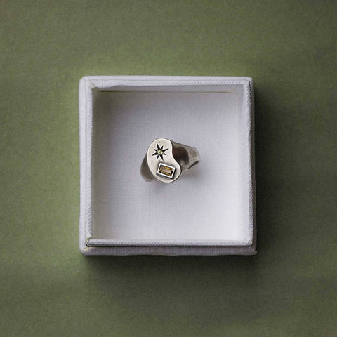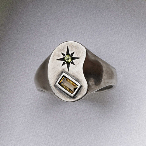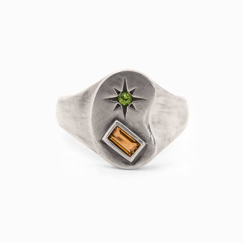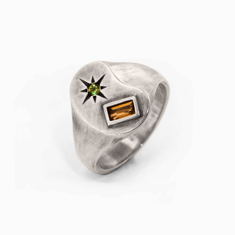The Lemon & Lime Signet Ring features a 11mm x 17mm face with a star set 2.5mm peridot gemstone and a 5mm x 2.5mm citrine gemstone, cast in 925 sterling silver.