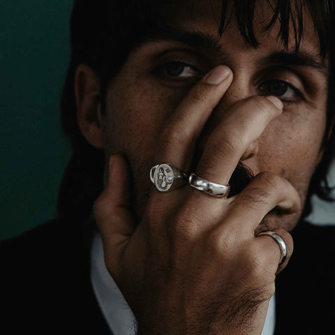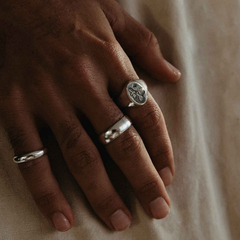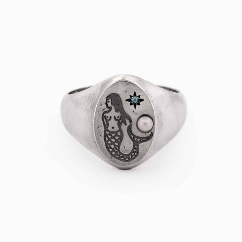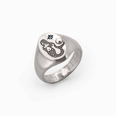 A Signet Ring With Mermaid Engraving, Pearl & Blue Topaz |