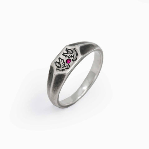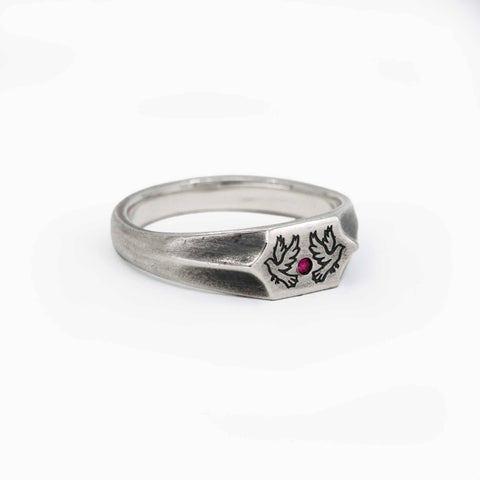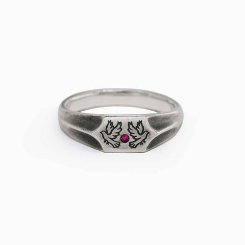 The 2 Birds 1 Stone Signet Ring features a 7mm x 7mm face set with a 1.5mm ruby framed by two bird engravings, cast in 925 sterling silver.