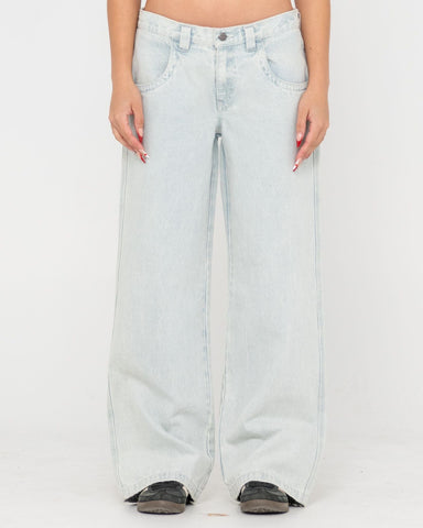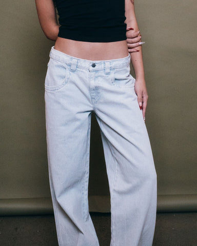 Low Rise Wide Leg Denim Pant With Contrast Details And Embroidery Features. 100% Cotton Indigo Denim