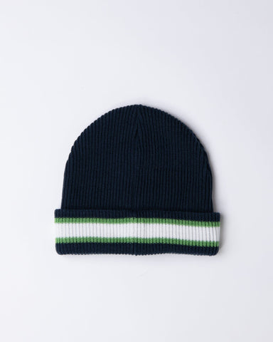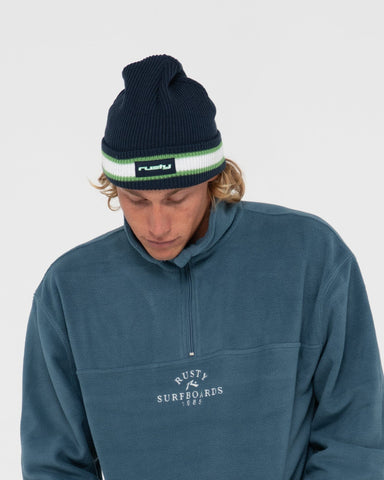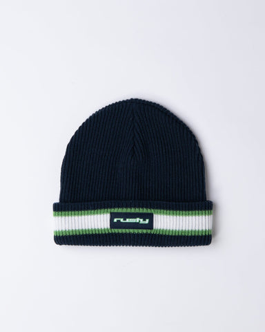 Cuffed Beanie With Jacquard Stripe And Rusty Woven Label. Material: Soft Acrylic