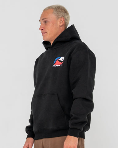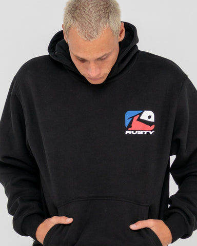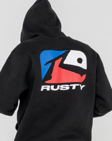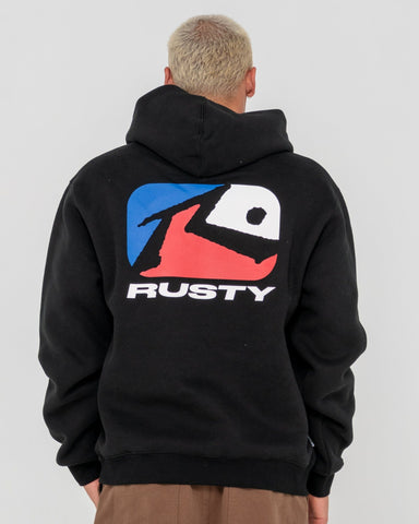 R2k Oversized Fit Hooded Fleece With Rusty Chest And Back Print. 58% Polyester / 42% Cotton Fleece