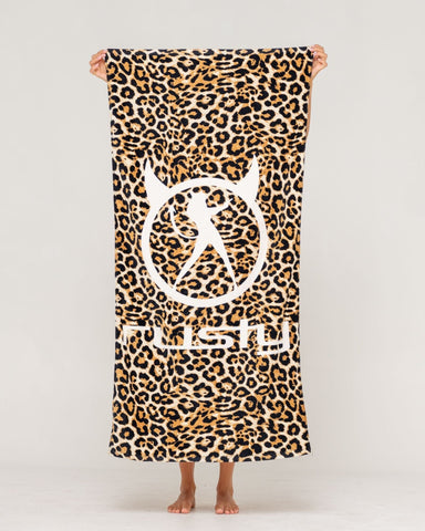 Towel With Custom Printed Pattern And Rusty Logo. 100% Cotton Velour Towel Fabric