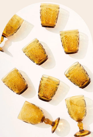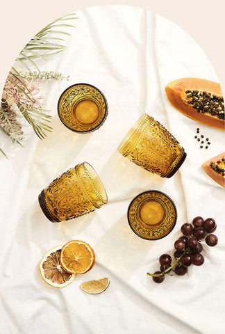 Set of 4 x Tumblers in amber glass. Decorative and functional, their embossed texture adds elegance to any cold beverage at your picnic or home.