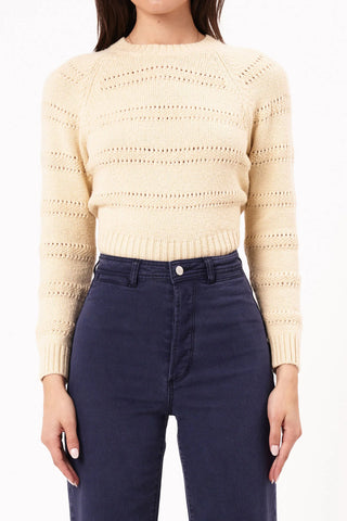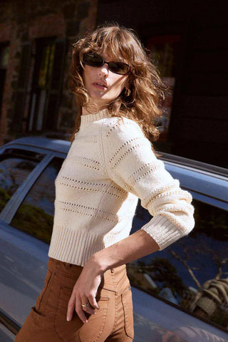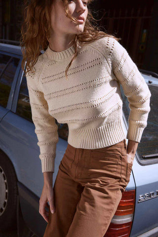 - Nostalgic ladder stitch detail through out body and sleeve creating cut out effect