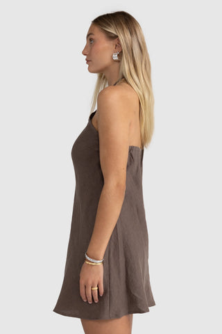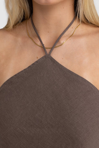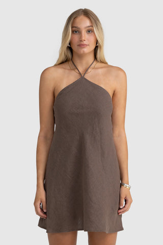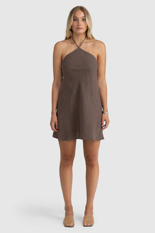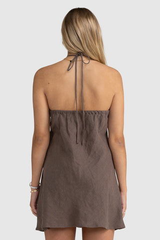Discover the elegance and ease of the Zia Linen Mini Dress Bark - the perfect choice for effortless day-to-night wear. Featuring a halter neckline, elasticated back top edge, and mini length, this dress is a must-have for your wardrobe.