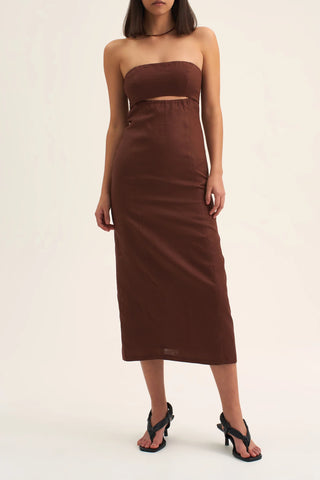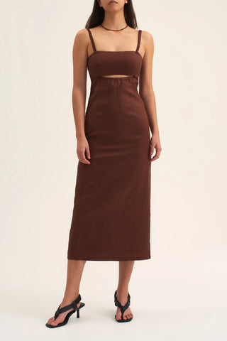 The River is a fitted midi dress style cut in our Chocolate Linen. This fitted style features a bust panel with a cut out underneath the bust with an elastic channel. Aslo featuring a removable strap detail so the dress can be worn with or without.